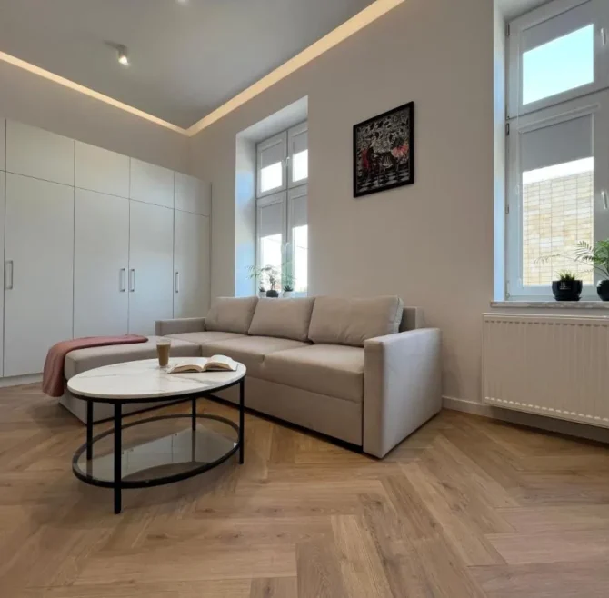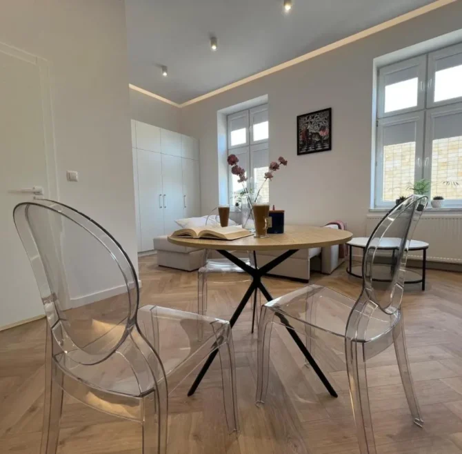 Przytulne studio 37 m² z klimatyzacją, aneksem kuchennym i prywatną łazienką – idealne miejsce na komfortowy pobyt z nutą domowego ciepła.